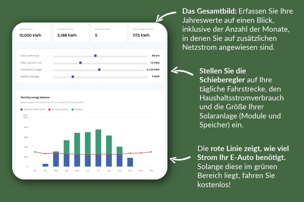 Finden Sie heraus, ob eine Photovoltaikanlage auf Ihrem Dach den Strombedarf Ihres Elektroautos vollständig decken kann — Monat für Monat, inklusive saisonaler Schwankungen und Haushaltsverbrauch.